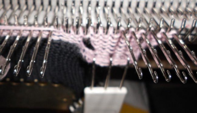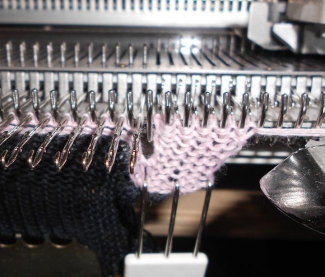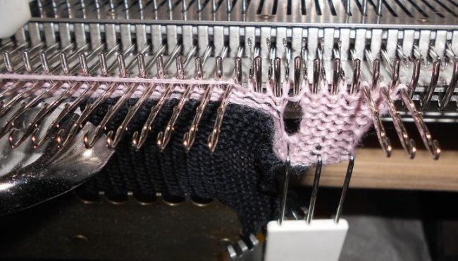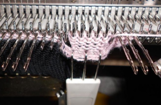 Выводим крайние правые 3 иглы из работы, перед нами вновь 6 петель, провязываем 9 рядов, чтобы каретка оказалась опять справа. Не забываем переносить грузики по мере необходимости.