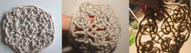 Узел сплетен, он настолько прочен, что его легко поднять рукой. Здесь, на Ярмарке мастеров, я видела, что кто-то мастерит из подобных узлов береты.