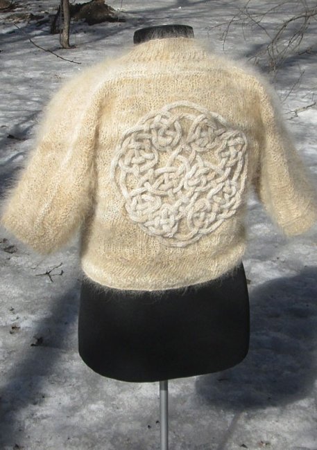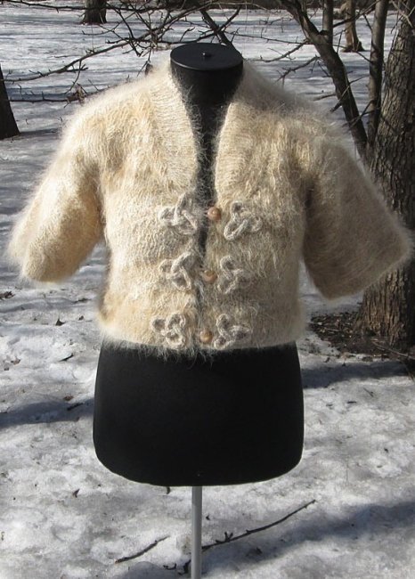 Теперь нам нужно изделие, на которое будет пришиваться данный орнамент. Изделием явилась кофточка, связаная из шерсти колли, короткая с цельновязанным рукавом. Все узоры, которые я ей вывязывала, скрылись за распушившеюся шерстью.