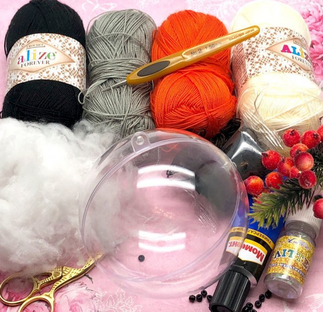 - Пряжа типа Alize forever (100% микрофибра акрил; вес: 50 г, длина нити в мотке: 300 м) или другая аналогичная — черного, ярко оранжевого, серого, белого и коричневого цветов;