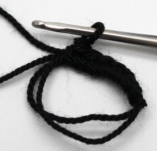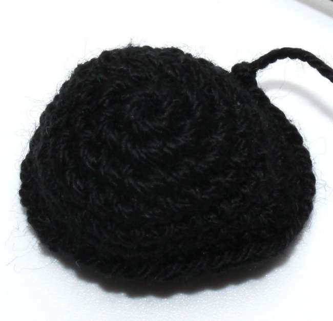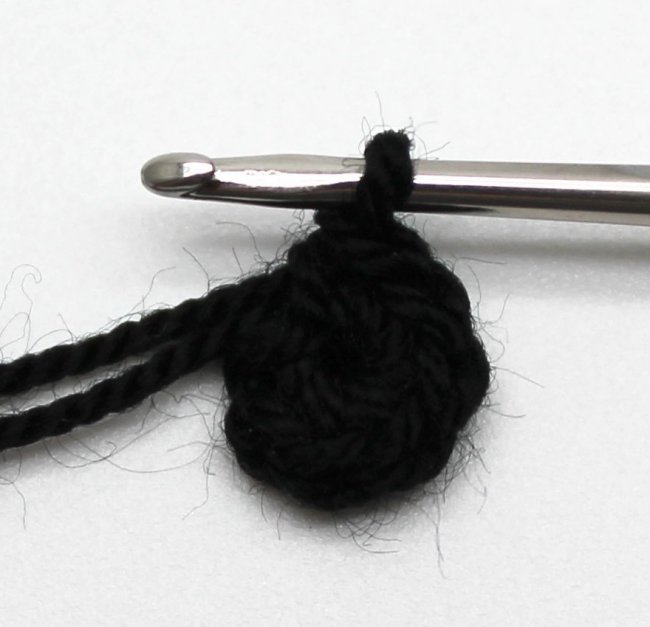Ряд 1: Выполнить черной нитью кольцо амигуруми, 1 в.п., 6 СБН в кольцо, стянуть кольцо амигуруми. (6 СБН)