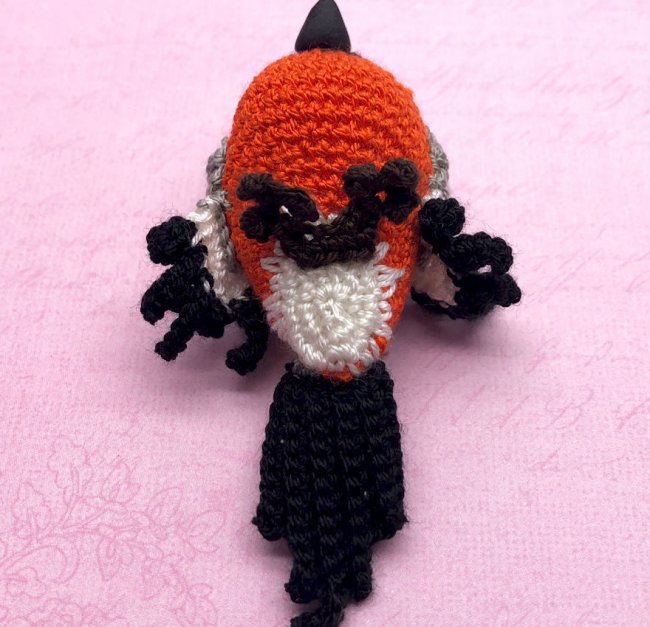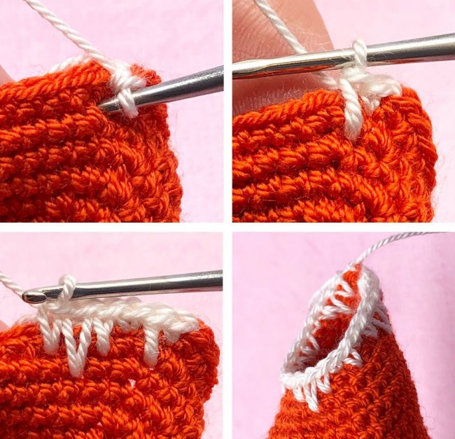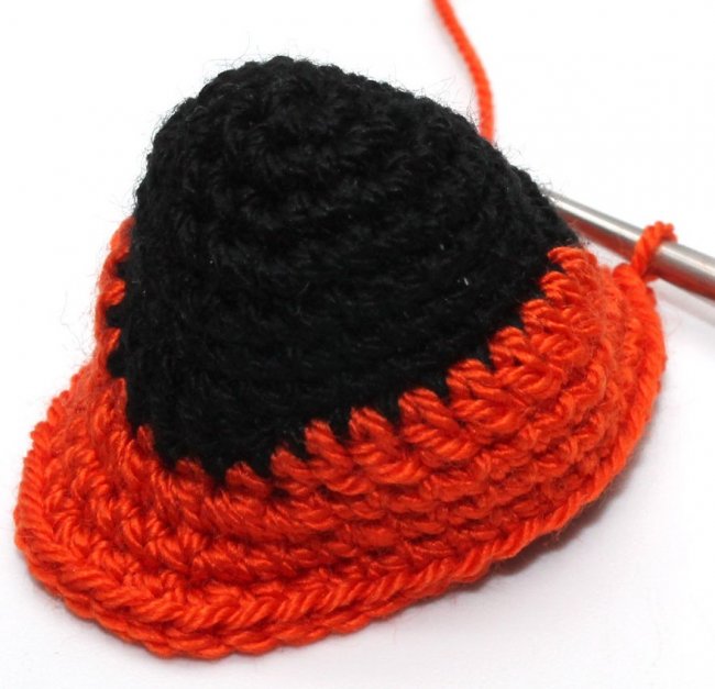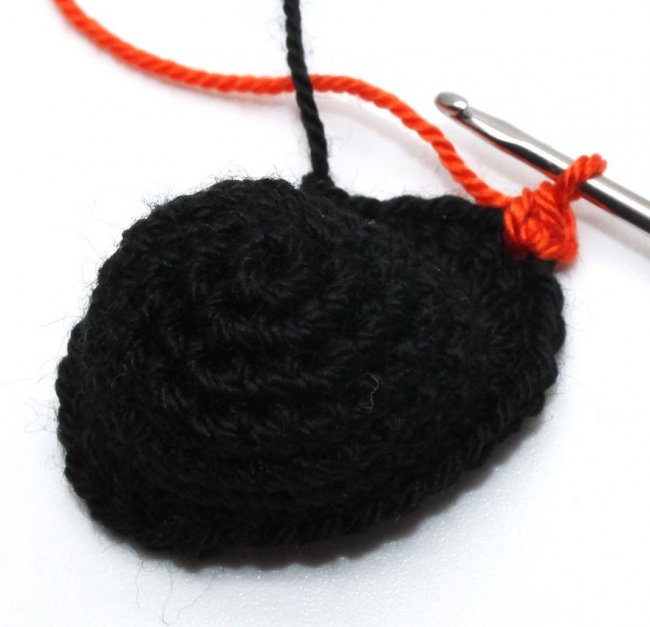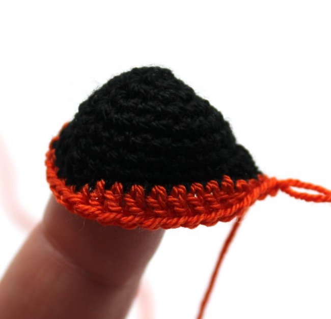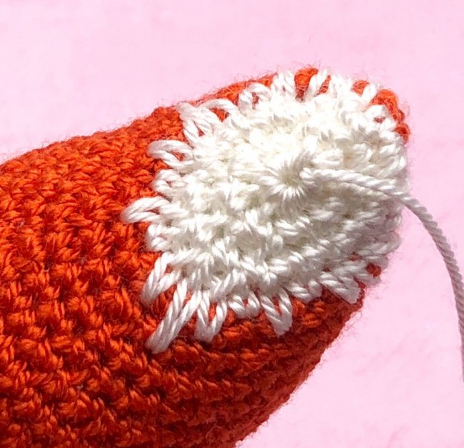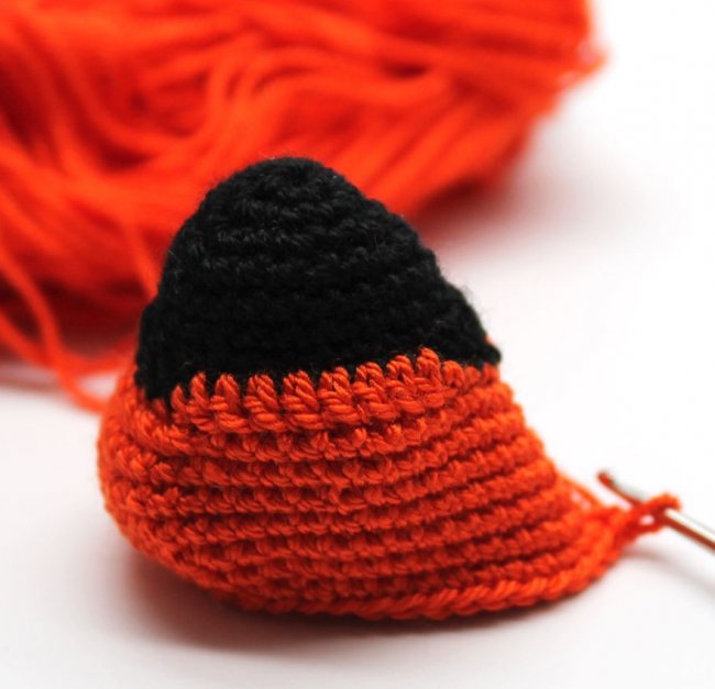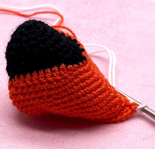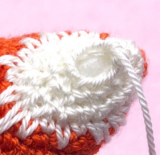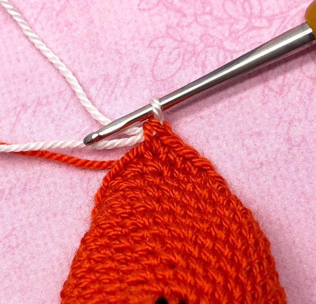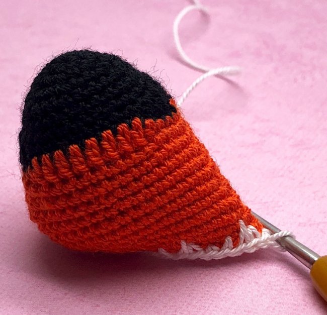 Ряд 19: 2 СБН в 1-ю п., СБН в след. 4 п., *убавка, СБН в след. п.* — 2 раза, убавка, СБН в след. 2 п., *убавка, СБН в след. п.* — 2 раза, убавка, СБН в след. 4 п., 2 СБН в след. п., при выполнении последнего столбика, перейти на белый цвет, оранжевую нить отрезать и закрепить. (24 п.)