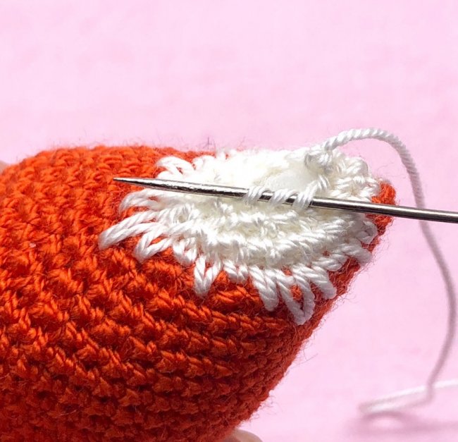 Вывести белую нить около 1-го глазика, вышить нижнее веко, затем увести иглу ко второму глазику, вышить 2-й глазик и увести иголку вниз, закрепить нить, спрятать ее в туловище и отрезать.