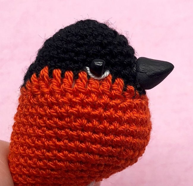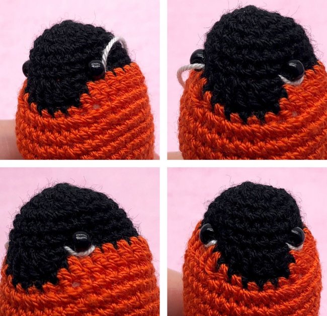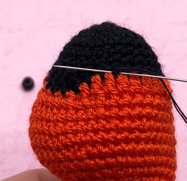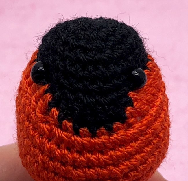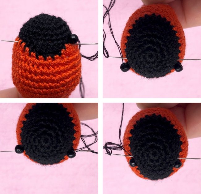 Пришиваем глазки-бусинки. Я пришила их между 2-м и 3-м столбиком с накидом.