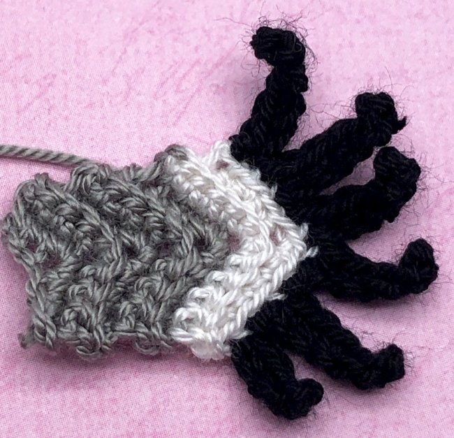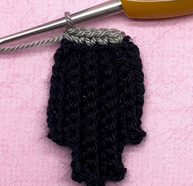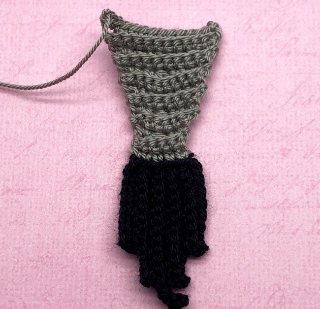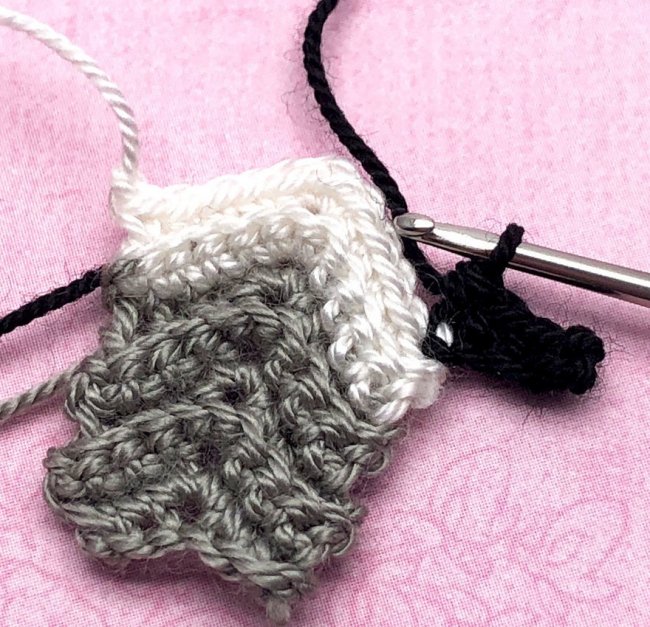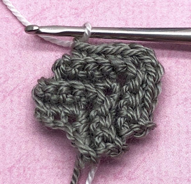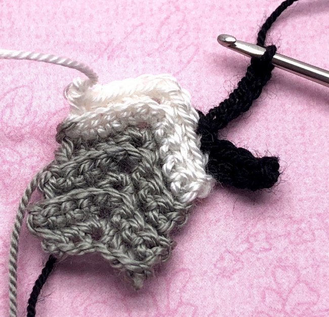 Ряд 5: убавка, СБН в след. 2 п., 3 СБН в след. п., СБН в след. 2 п., убавка, при выполнении 1 в.п. поворота перейти на белый цвет, серую нить отрезать, оставив хвостик нити около 25 см, повернуть. (9 СБН)
