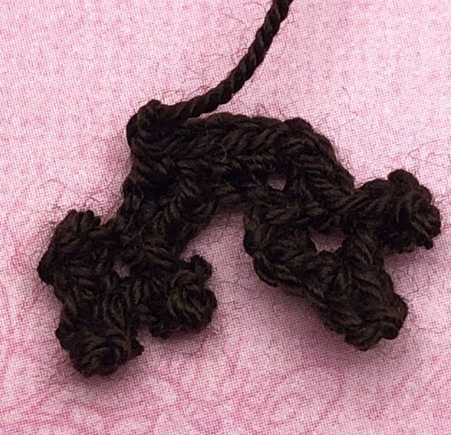 Набрать коричневой нитью 5 в.п.,СБН во 2-ю п. от крючка, СБН в след. п., 3 в.п., СБН во 2-ю п. от крючка, СБН в след. п., ПСБН в основание 1-го пальца, 3 в.п., СБН во 2-ю п. от крючка, СБН в след. п., ПСБН в основание 1-го пальца, СБН в след. 2 п., 7 в.п., СБН во 2-ю п. от крючка, СБН в след. п., 3 в.п., СБН во 2-ю п. от крючка, СБН в след. п., ПСБН в основание 1-го пальца, 3 в.п., СБН во 2-ю п. от крючка, СБН в след. п., ПСБН в основание 1-го пальца, СБН в след. 2 п., 1 в.п., провязать 4 СБН по основанию двух лапок.