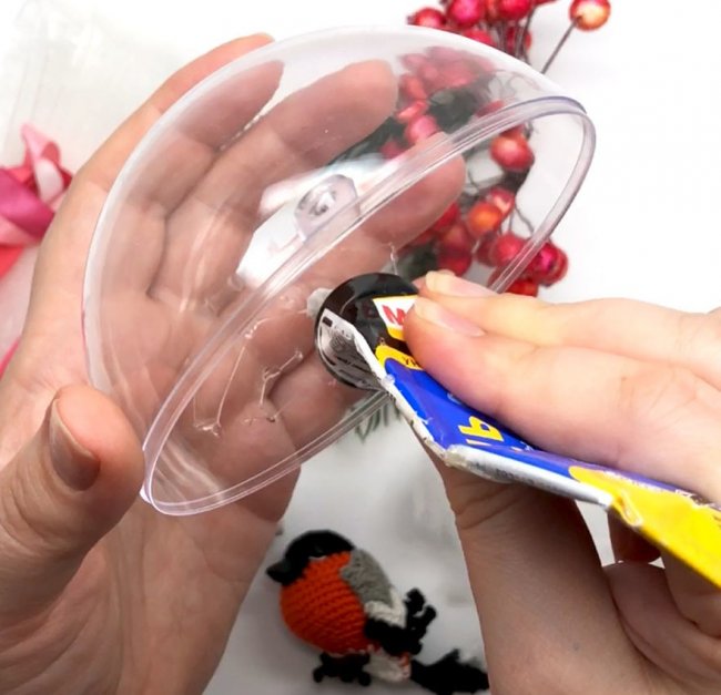 Посмотреть расположение композиции в шаре и зафиксировать термоклеем.