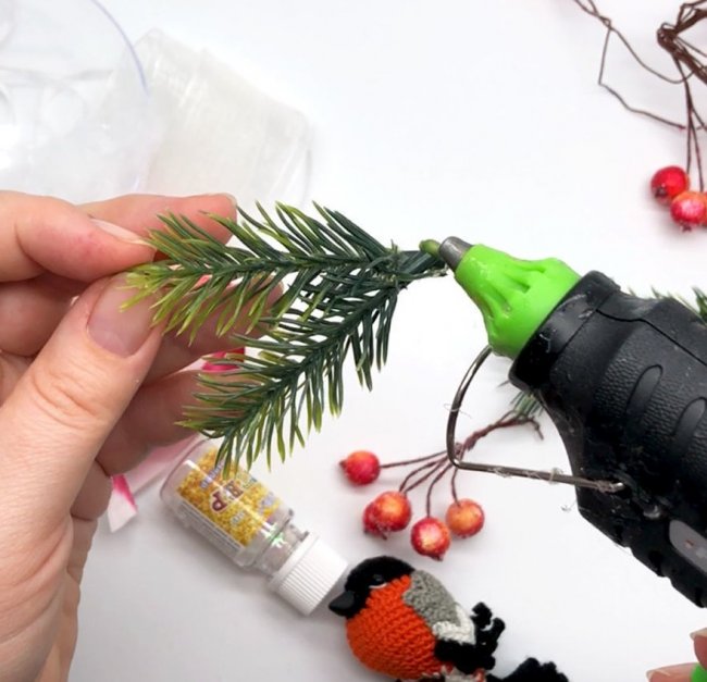 Замаскировать клей «снегом». Добавить немного «снега» во 2-ю половинку шара, насыпать глиттер в обе половинки шара. Если не планируете ничего менять, аккуратно нанесите клей на края одной из половинок шара и плотно закройте его.