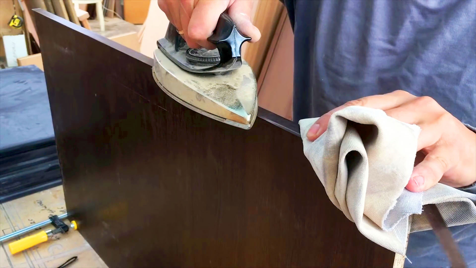 Когда клей высох, я выравниваю и прихватываю кромку утюгом. Важно настроить утюг так, чтобы он не перегревался, иначе кромка пойдет волнами. Также нужно хорошо выровнять и отшлифовать поверхность, иначе она будет царапать кромку. После того как я прохожусь утюгом и прихватываю кромку, я начинаю клеить. Я давлю на утюг достаточно сильно, чтобы он хорошо прижал кромку к детали. Вслед за утюгом я придавливаю кромку тряпочкой. Тряпочка защищает от порезов и ожогов, а также помогает кромке быстрее остыть и не подниматься.
