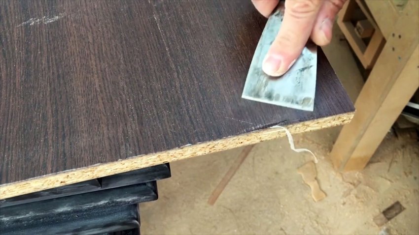 Клей, попавший на пластик, легко удаляется как до, так и после поклейки кромки. Я делаю это шпателем, который не затачиваю с одной стороны, чтобы не царапать или резать пластик.